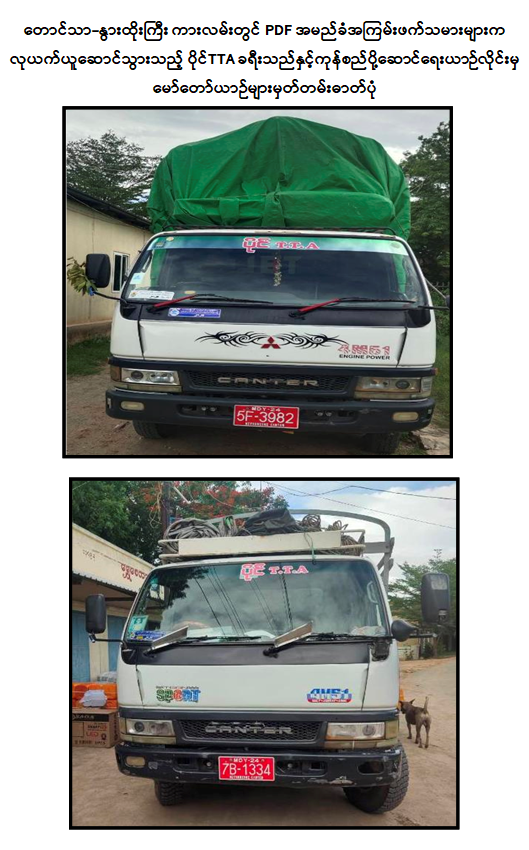 PDF terrorists in three vehicles arrived at the place between Yankinthasi village in Taungtha Township and Shwekyainn village in Natogyi Township of Mandalay Region on 2 July. They inspected the “Paing TTA” passenger bus on the Taungtha-Natogyi road and stole four AD vans, two Succeed, three Probox and two six-wheel vehicles.