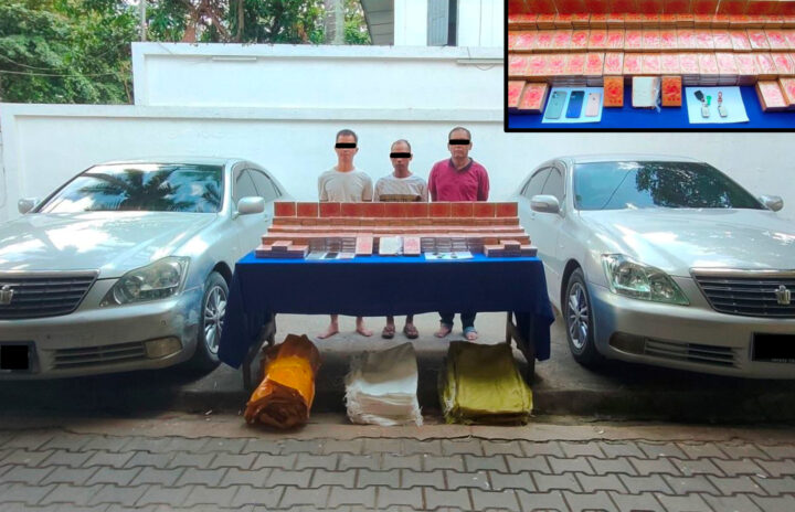 A combined team consisting of the anti-narcotics police stopped and searched the two Toyota Crowns and found 300 blocks of heroin weighing 105 kilogrammes worth K1.575 billion from Sai Wunna, Nyi Lin (aka) Aik Htun and Aung Win in Weinkyauk Ward, Tachilek, at 5:30 pm on 9 July.