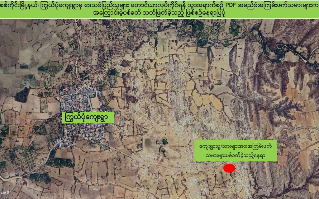 In April 2023, PDF terrorists also targeted Kywelpone village with bombings, resulting in eight deaths, including five children and thirty-one injuries. Additionally, on 16 September, a monk travelling from Kayutode village in Mandalay Region was attacked by PDF militants who stole his motorcycle, phone, and money, leading to the monk’s death from injuries sustained during the attack. Another incident in Myaing Township involved the killing of a woman in her home by PDF militants.