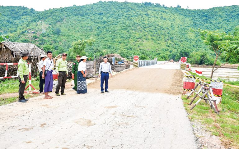 Subsequently, he examined the construction of a 80-foot two-layer temporary bailey bridge at the site where the approach road to the Zeephyupin Village bridge across the Paunglaung River had been damaged by water erosion.