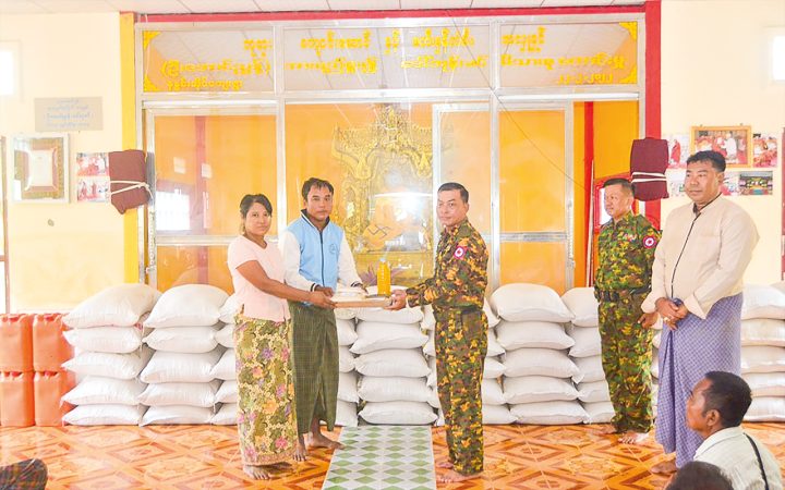 In addition, Commander Maj-Gen Soe Min of the Nay Pyi Taw Regional Command and other officials visited affected areas in Lewe Township, including Shwetaiktan Village and Nanwinn Ai Village monasteries, to meet with monks and provide them with donations. They offered food supplies such as rice, oil, salt, and dried fish to the flood-hit residents in these areas. They then oversaw community cleaning efforts at local schools and monasteries.