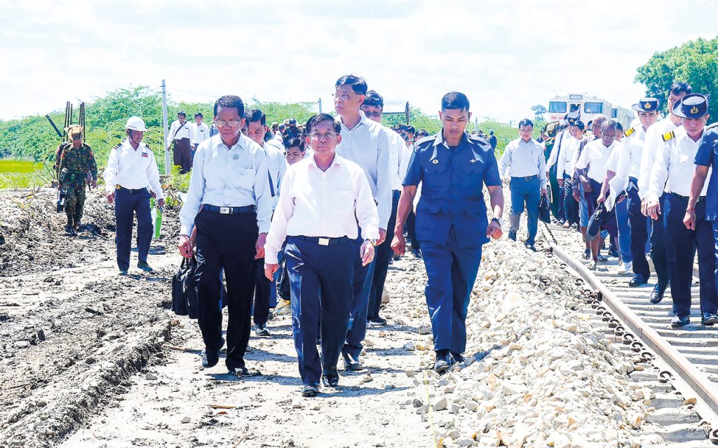 Chairman of the State Administration Council Prime Minister Senior General Min Aung Hlaing, accompanied by Council Joint Secretary General Ye Win Oo, Council members General Mya Tun Oo and General Maung Maung Aye, union ministers and officials, yesterday morning inspected repairing of Samon Creek Bridge damaged in recent flooding on Thazi-Mandalay railway.