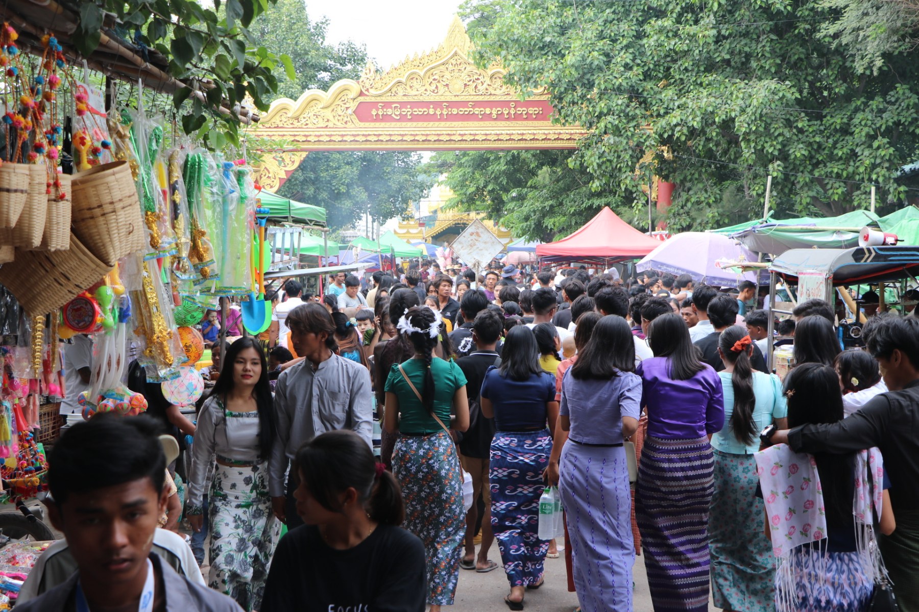 The traditional Buddha Pujaniya Festival continued in the evening at the Maha Thetkyamarazein Kyauktawgyi Pagoda, Maha Lawkamarazein Pagoda, and Candamuni Pagoda, where thousands of devotees participated in offering alms, flowers, and electric lighting and oil lamps as acts of merit. Evening festivities were incredibly vibrant, with throngs of devotees filling the pagoda precincts.