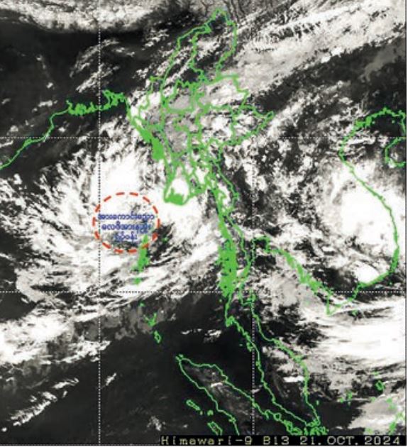 Due to the Well Marked Low-Pressure Area, rain or thundershowers are likely to be fairly widespread to widespread in Nay Pyi Taw, Sagaing. Mandalay, Magway, Bago, Yangon, Ayeyawady, Taninthayi Regions and Chin, Rakhine, Kayin and, Mon States with likelihoodof regionally heavyfalls, isolated heavyfalls and strong winds from tonight up to 24 October 2024.