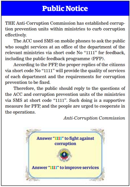 Therefore, the public should reply to the questions of the ACC and corruption prevention units of the ministries via SMS at short code “1111”. Such doing is a supportive measure for PFP, and the people are urged to cooperate in the operations.
