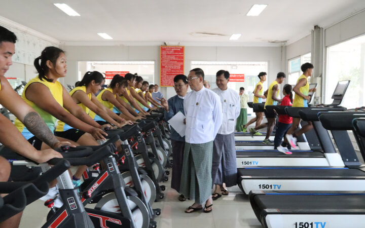 The Union minister observed the training sessions of the men’s sepak takraw team at the Lewe Township Sports Hall as well as the men’s volleyball team and (men’s and women’s) track and field teams at the Wunna Theikdhi Sports Complex.
