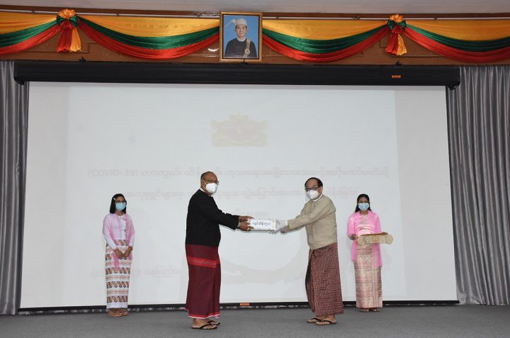 Deputy Minister for Planning, Finance and Industry U Maung Maung Win explained the donation from the staff members of his ministry who also took part in adopting the COVID-19 Economic Relief Plan, in the process of getting international loans, relaxing financial rules in the government’s response to the pandemic, extension of budget expenditure period, production of ambulance cars, medicines and personal protective equipment from the factories under the ministry. Director-General Dr Sai Kyaw Naing Oo from the Department of Technical and Vocational Education and Training talked about the volunteer services of teachers under the department and production of robot trolley, and the cash donation was to honour health workers in fight against the pandemic.