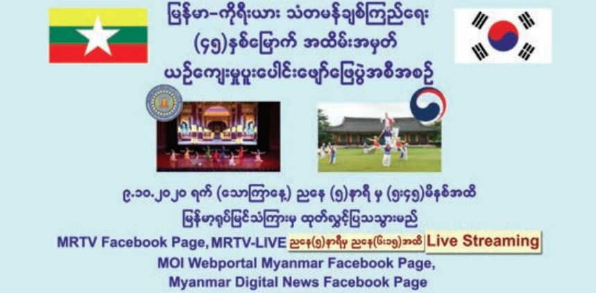 THE ‘Myanmar-Korea Joint Cultural Performance’, to mark the 45 years of diplomatic relations between Myanmar and the Republic of Korea, will be broadcast on MRTV and Myanmar Radio from 5 to 5:45 pm today, and the live streaming of the event will be launched in MRTV Facebook page and MRTV Live from 5 to 6:30 pm.