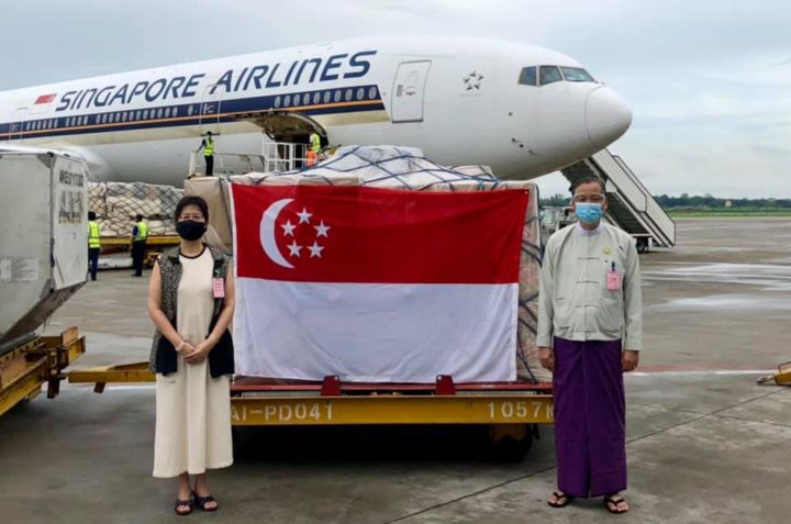 Officials from the Ministry of Health and Sports and Singapore Embassy in Myanmar welcomed the flight that carried the medical supplies from Singapore at the Yangon airport.