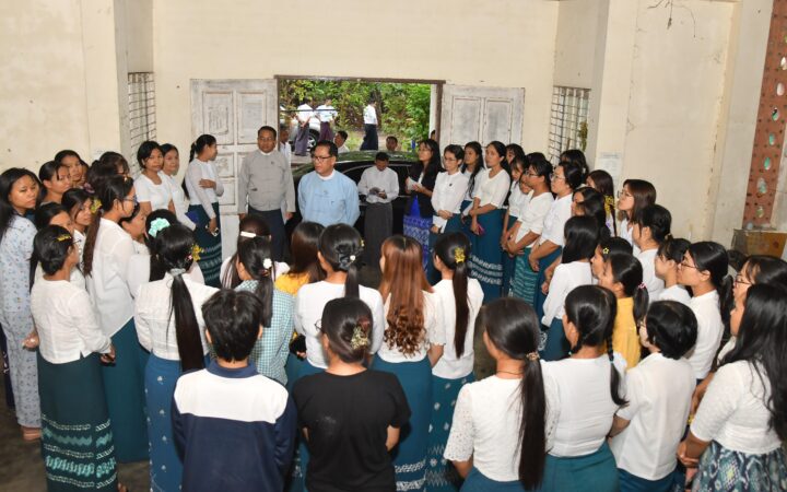 The Union minister first met staff members who returned to live at Thazin 7 and Thazin 1 dormitories for female staff in Zabuthiri and Bawga Theikdi wards and inspected the damage, relocation, and access to electricity and water.
