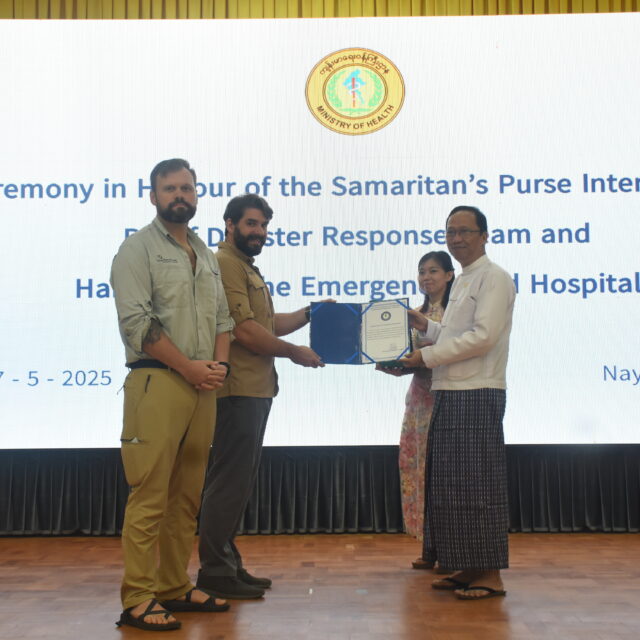 Samaritan’s Purse collaborated with the Ministry of Health and the Ministry of Defence to open a temporary field hospital at Shwekyapin Sports Ground Nay Pyi Taw from 5 April. The facility treated over 5,000 patients and performed 303 surgeries.