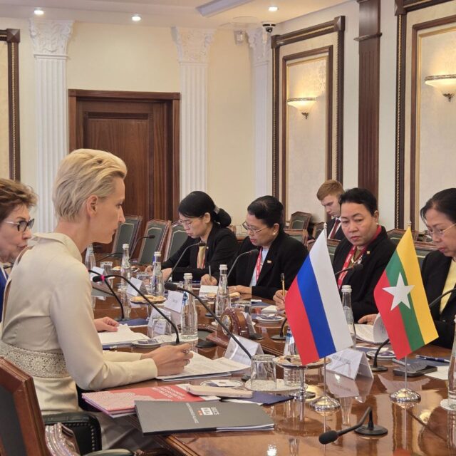 Also present at the meeting were Daw Nilar, wife of the SAC Joint Secretary, the wife of the Chief of the General Staff (Army, Navy and Air), Vice-President of Myanmar Women’s Affairs Federation Daw Khin May Soe, the wife of the Myanmar Ambassador to the Russian Federation and officials. The Chairperson of the Russian Chapter of the BRICS Women’s Business Alliance was accompanied by officials.