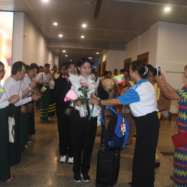 They arrived back in Yangon yesterday evening, and were welcomed back by Yangon Region Social Affairs Minister U Htay Aung, Headmistress Dr Sandar Mya Nyein and teachers, parents and officials holding the State flag, vinyl posters and flowers in their hands.