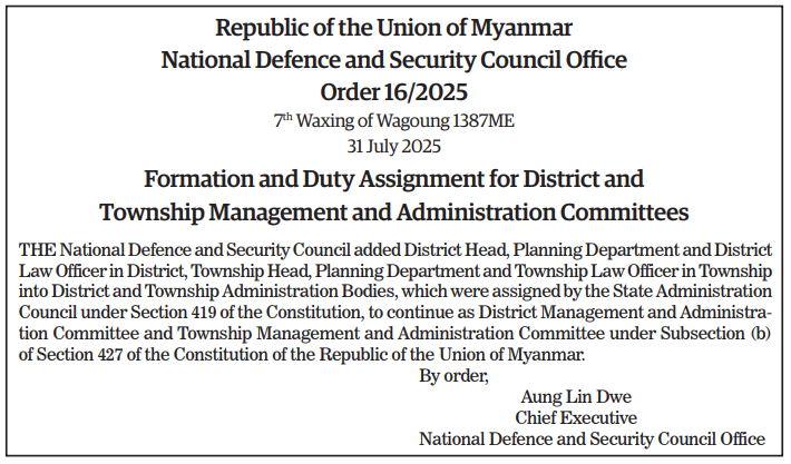 Submitted by moiuser3 on 1 August 2025 Republic of the Union of Myanmar National Defence and Security Council Office Order 16/2025