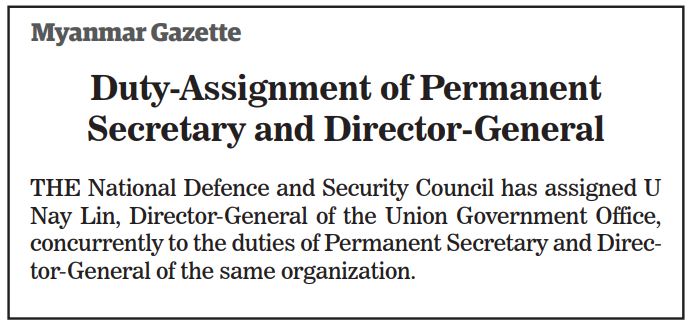 Submitted by moiuser3 on 7 August 2025 THE National Defence and Security Council has assigned U Nay Lin, Director-General of the Union Government Office, concurrently to the duties of Permanent Secretary and Director-General of the same organization. #TheGlobalNewLightOfMyanmar