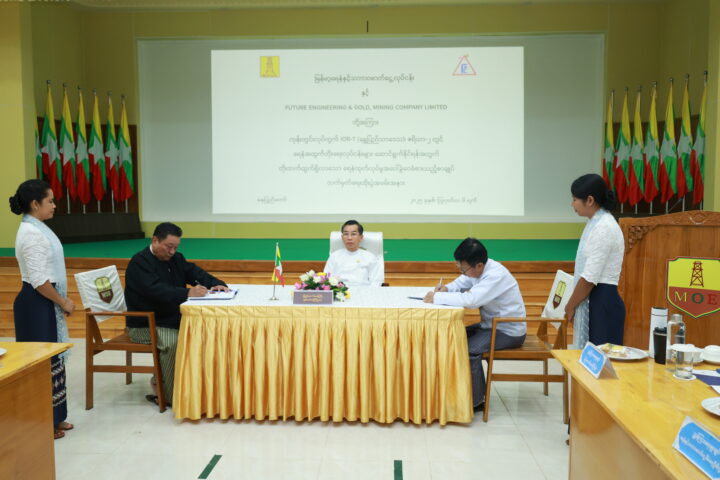 The Myanma Oil and Gas Enterprise of the Ministry of Energy signed production-sharing contracts with HNA Myanmar Oil & Gas Ltd for onshore block IOR-4 (Pyay) area-1 and IOR-6 (Myanaung) area-3 and with Future Engineering & Gold Mining Co Ltd for IOR-7 (Shwepyitha) area-2 in Nay Pyi Taw yesterday.