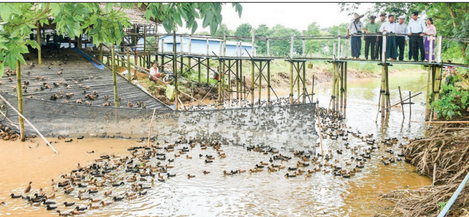 Afterwards, he also visited U Myo Naing’s duck farm in Yanlonnaing Village, Taikkyi Township, to look into the commercial layer duck raising operation, which includes 5,000 adult ducks and 6,000 ducklings, as well as the 15,000 layer ducks raised at the farm of Supreme Development Co Ltd. Water supply process was inspected at Thanatchaung Dam near the livestock zone in Taikkyi Township, including functions of water storage and capacity, the use of machinery to maintain a clean and attractive dam environment, and the construction of fish ponds and duck farms nearby; necessary measures were then coordinated with the officials.