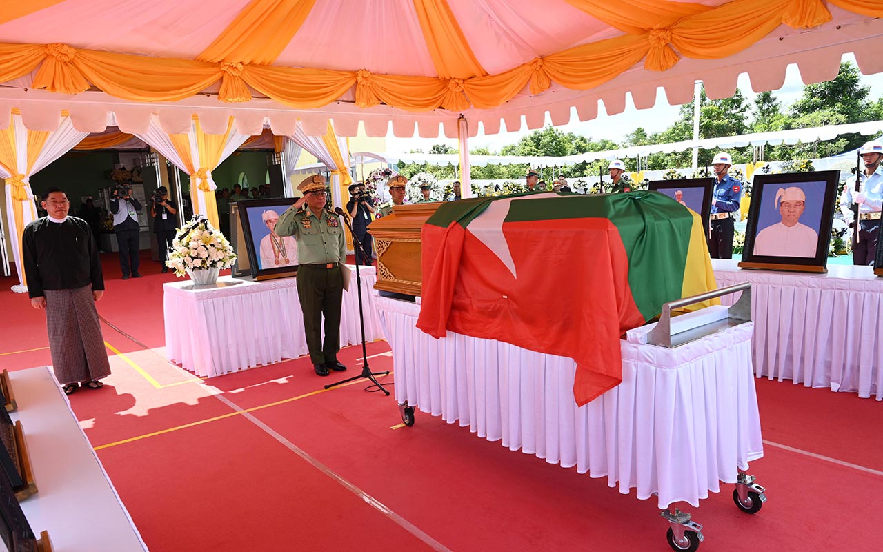 Likewise, the State funeral service was attended by Chairman of the State Security and Peace Commission of the Republic of the Union of Myanmar, Commander-in-Chief of Defence Services, Senior General Min Aung Hlaing and his wife Daw Kyu Kyu Hla, President (Retired) U Thein Sein, Vice-Presidents (Retired) Thiha Thura Tin Aung Myint Oo and U Nyan Tun, Vice-Chairman of the Commission, Deputy Commander-in-Chief of Defence Services, Commander-in-Chief (Army), Vice-Senior General Soe Win and his wife Daw Than Than Nwe, retired senior Tatmadaw officers, Commission member, Prime Minister and Union Minister for National Planning U Nyo Saw and his wife, Commission members and their wives, the Secretary of the Commission and his wife, Union-level dignitaries, Union ministers and their wives, retired Union-level dignitaries and retired Union ministers, the Nay Pyi Taw Council Chairman, senior Tatmadaw officers from the Office of the Commander-in-Chief, representatives from social organizations, Daw Khin Thet Htay who is wife of the late Pro Tem President U Myint Swe and family members, relatives, guests and religious associations.