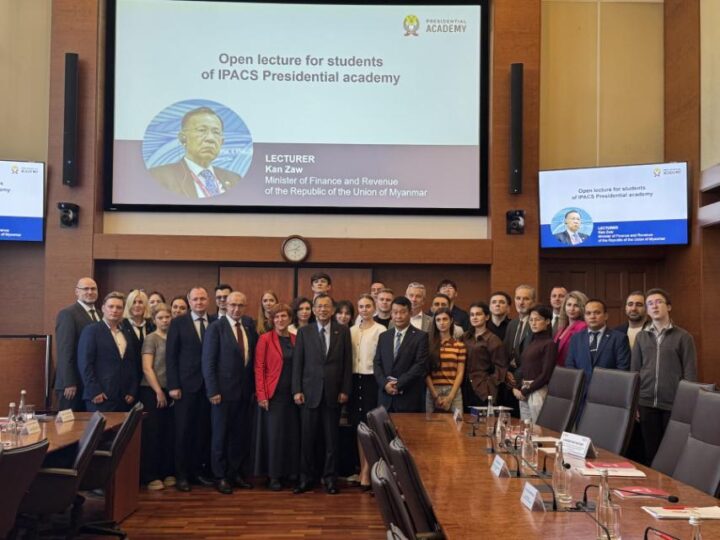 The Union minister, together with the Deputy Chairman of the State Duma, visited the Russian Presidential Academy of National Economy and Public Administration (RANEPA) at the invitation of the vice-rector of the Russian Presidential Academy. He discussed the topic of Economic Development of Myanmar, and observed around the school buildings.