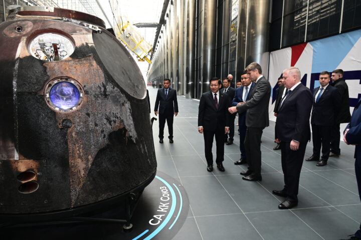 On arrival at the head office of Roscosmos, the Acting President and SSPC Chairman of the Republic of the Union of Myanmar and party were warmly welcomed by the Roscosmos Director-General and officials. The Senior General and party observed a scale model of a satellite to be launched to the space and visited the control room, which directly connects with satellites in orbit. The Senior General responded to the clarification of the Director-General of the State Space Corporation “Roscosmos” and officials.