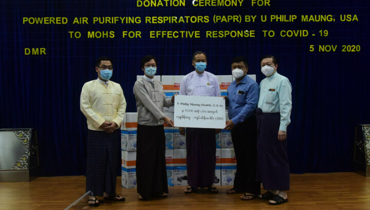 Mr Philip Maung, founder of Hissho Sushi in Seattle of the United States, presented 50 sets of respirators worth K35 million at the Medical Research Department on Zewaka Road in Dagon Township, Yangon.