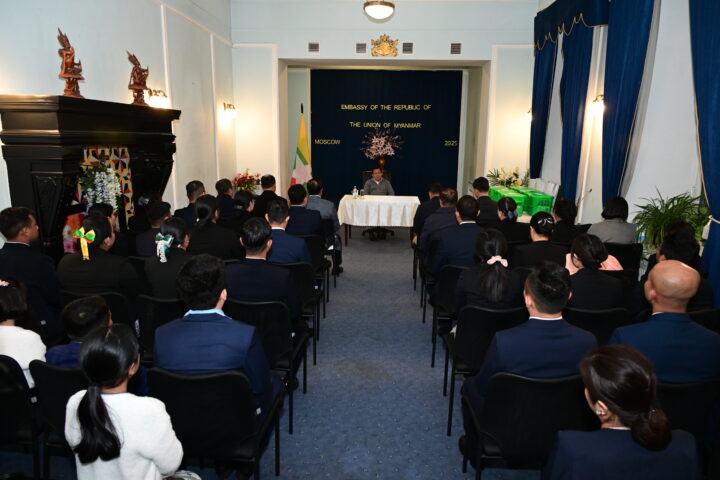 Speaking on the occasion, the Senior General said that he was pleased to have had the opportunity to meet with the families of the Myanmar Embassy to the Russian Federation, the Military Attaché’s Office, and Myanmar scholarship trainees. He arrived there to attend the “World Atomic Week Forum”, which he attended yesterday in the Russian Federation, due to the invitation. Not long ago, he also attended the Shanghai Cooperation Organization (SCO) Summit 2025 Plus in the People’s Republic of China, as well as the military parade marking the 80th anniversary of the victory in the Chinese People’s War of Resistance Against Japanese Aggression and World Anti-Fascist War. Participation in such international events brings beneficial outcomes for Myanmar. For the families of the Embassy and the Military Attaché’s Office, it is important to be aware of and understand the real political changes and the actual situation in the State.