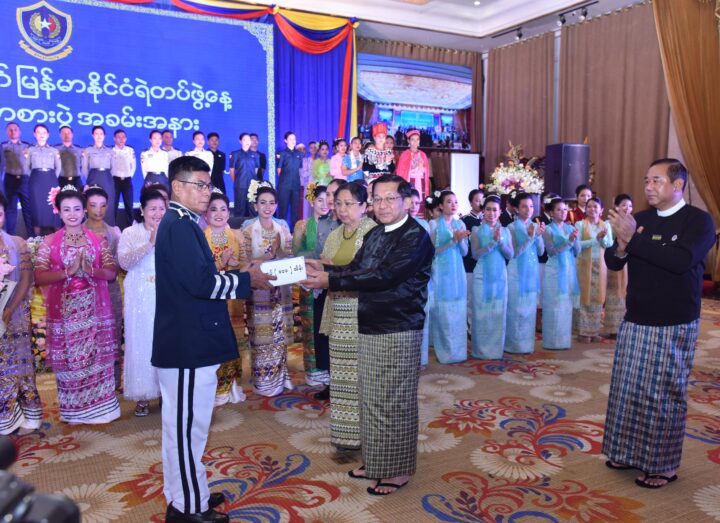 After the dinner, the Acting President and SSPC Chairman of the Republic of the Union of Myanmar and his wife presented the flower basket and cash awards to members of the MPF band and entertainment troupes and artistes.