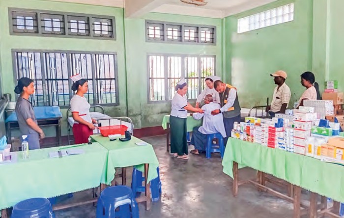While the 150-bed Kyaukme General Hospital, damaged by terrorist sabotage, is being renovated, a temporary hospital is operated at Labha Muni Chinese Temple in Ward 2, Kyaukme, to provide medical services to the local population. The facility is staffed by seven health workers, led by Dr Tun Nyunt Oo, Head of the Shan State (North) Department of Public Health and Medical Services, and Dr Myo Aung, Deputy Head of the District Medical Services Department. Today, a total of 55 patients 22 men and 33 women received health care services.