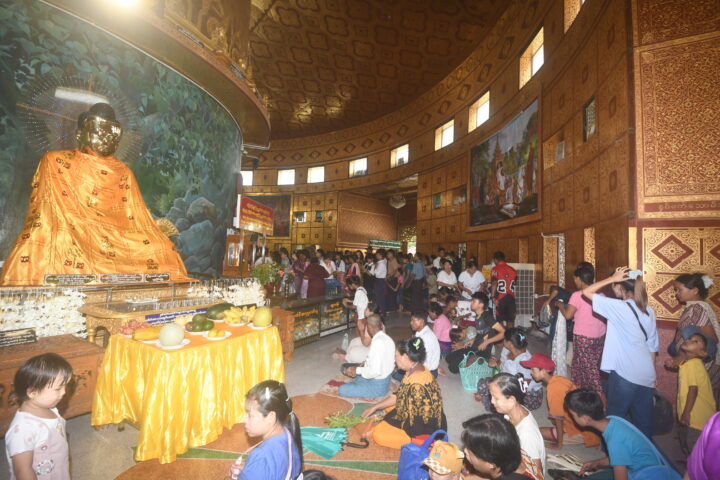 Similarly, at the ceremonies for the Full Moon Day of Thadingyut and Abhidhamma Day held by the trustees of the Botahtaung Pagoda, Kaba Aye Pagoda, the historically renowned Santawshin Kyaikwyne Pagoda, Maha Wizaya Pagoda, Sule Pagoda, Sacred Tooth Relic Pagoda (Yangon), Lokachantha Abhaya Labhamuni Buddha Image on Mindhamma Hill, Ngahtetgyi Pagoda, Chaukhtetkyee Pagoda, Shwephonepwint Pagoda, Eaindawya Pagoda, and Meilamu Pagoda, pilgrims received the Nine Precepts from venerable Sayadaws. In the evening, oil lamps were lit by worshippers in dedication to the Lord Buddha.