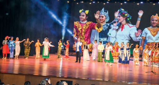 Moreover, artistes from the National University of Arts and Culture presented dances portraying six eras, the song Oh, My Scythe, and the Kalinka dance. Vocalist La Wun May from MRTV sang the songs The River, The Myanmar, and The Thingyan. The Myawady Entertainment Troupe performed the song May the Union Remain Forever, while vocalists from the Russian Embassy presented the songs Zhavoronok, Bagan, We Are Together, Myanmar, Mother Earth, Katusha, The Motherland, All the Flowers and I Want to Wish with performances.