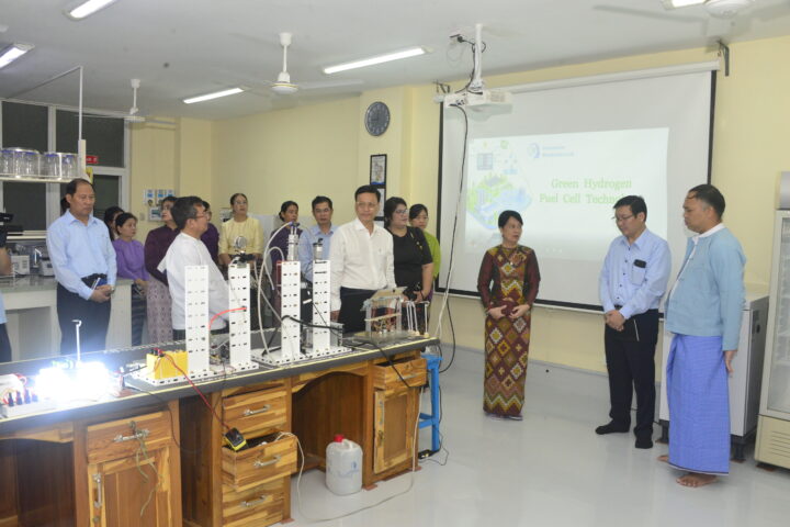 Union Minister for Education Dr Chaw Chaw Sein, accompanied by Deputy Minister Dr Zaw Myint and relevant officials, visited the Innovative Biophysics Lab at the Centre for Research and Innovation, University of Yangon, yesterday morning to observe the ongoing research project on an energy system using green hydrogen fuel cell technology for electricity generation.
