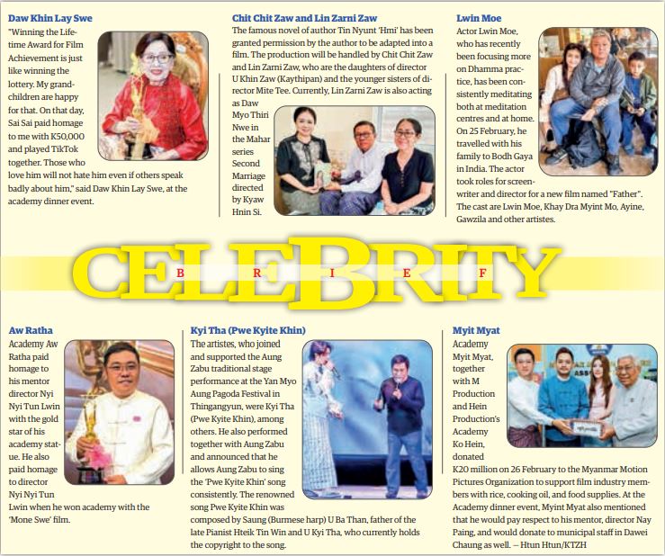 THE Myanmar Motion Pictures Organization (MMPO) held a ceremony on the evening of 26 February to honour the recipients of the 2025 Academy Awards and those who supported the event. The organization presented K500,000 to each Academy awardee. The patrons and executive members also presented gifts to those who supported the event. The organization also hosted a dinner for the attendees. The event was attended by MMPO executive committee members, patrons, Academy Award and Lifetime Achievement Award-winning artistes and professionals, individuals who had contributed support to the awards ceremony, and invitees.