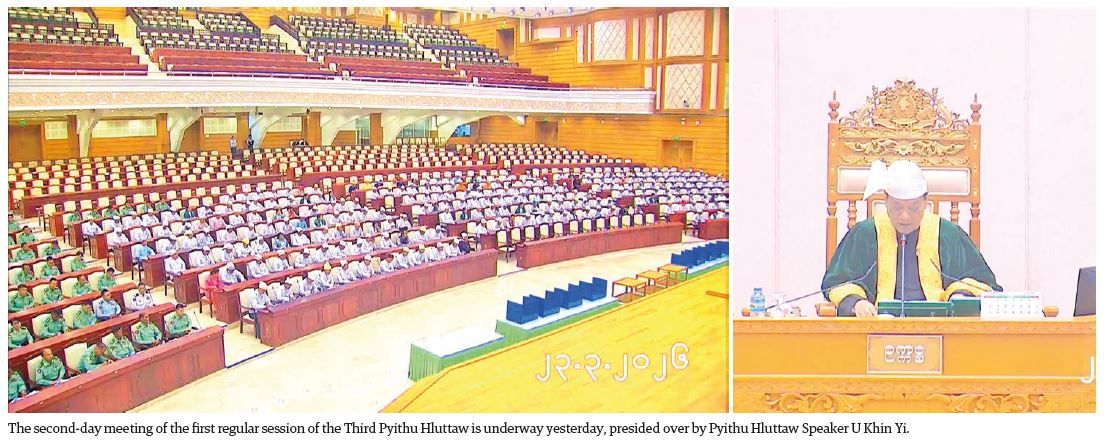 The first regular session of the Third Pyithu Hluttaw continued its second-day meeting at the convention hall of the Pyithu Hluttaw at Hluttaw Complex in Nay Pyi Taw yesterday morning.
