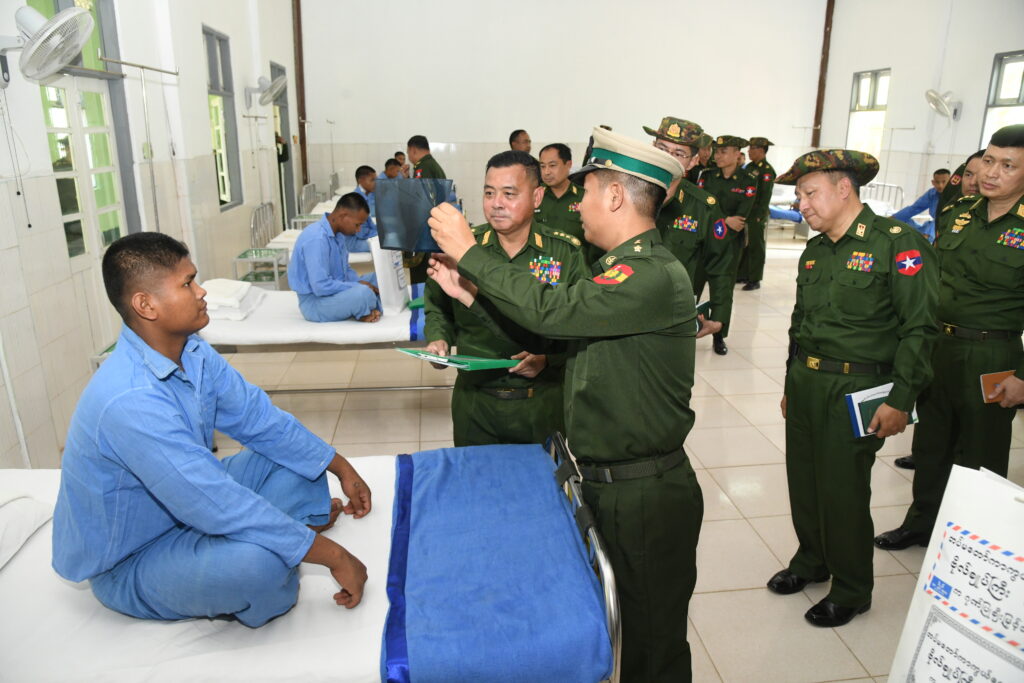 General Ye Win Oo met and offered words of encouragement to officers and soldiers, members of the Myanmar Police Force, and members of the People’s Militia (local) who are receiving medical treatment there.