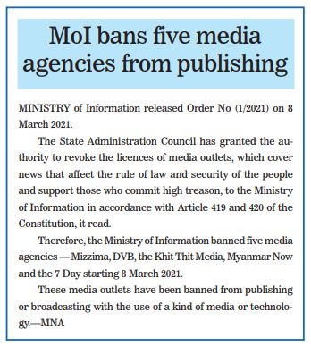 Submitted by admin on 10 March 2021 MoI bans five media agencies from publishing #The Global New Light of Myanmar