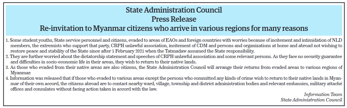 4. Information was released that if those who evaded to various areas except the persons who committed any kinds of crime wish to return to their native lands in Myanmar of their own accord, the citizens abroad are to contact nearby ward, village, township and district administration bodies and relevant embassies, military attaché offices and consulates without facing action taken in accord with the law.