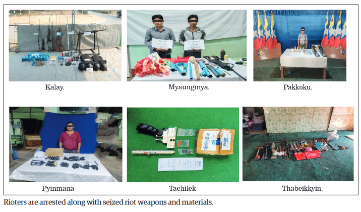 POLICE seized weapons and arms used in riots on 7 April. The security forces arrested U Aung Aung, son of U Sein Maung who lives at No (3/196), between Thitsar and Padonmar streets in Oh Bo of Oo Yin Su Ward in Pyinmana Township, Min Kaung San, son of U Zaw Win, who lives at No (65), Aung Thu Kha street in Kyaik Phane Ward of Mawlamyine, NLD member Thein Zaw Oo from Myaynigone Village in Tit Pin Chaung Village-tract of Kawet Station of Myaungmya Township and Tun Tun Aung from Kungyan Village of Thongwa together with their weapons.