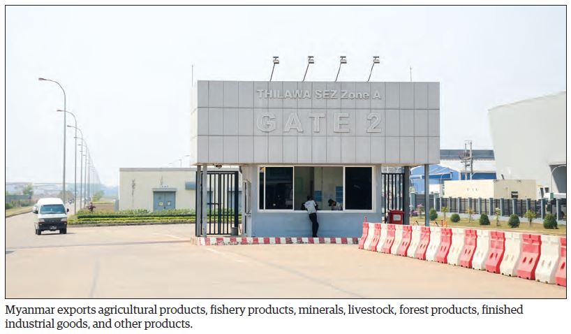 Myanmar exports agricultural products, fishery products, minerals, livestock, forest products, finished industrial goods, and other products.