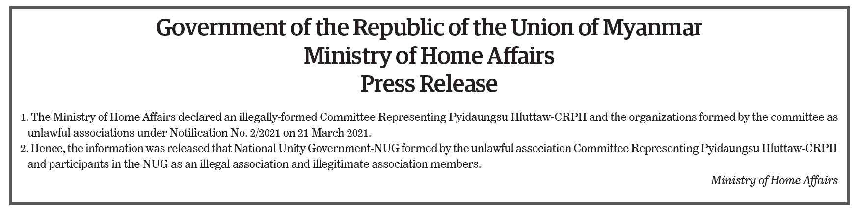 Submitted by moiuser on 21 April 2021 Government of the Republic of the Union of MyanmarMinistry of Home AffairsPress Release # TheGlobalNewLightOfMyanmar