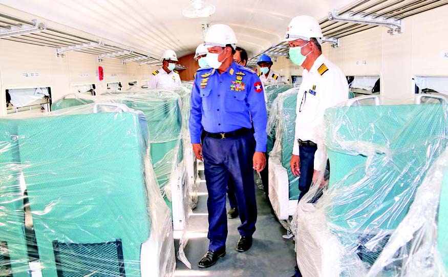 The Union Minister inspected Central Railways Station and related buildings, ship repair works at Yadanarbon Shipyard and new carriages purchased from China and the Republic of Korea at the Myitnge Carriage and Wagon Workshop.