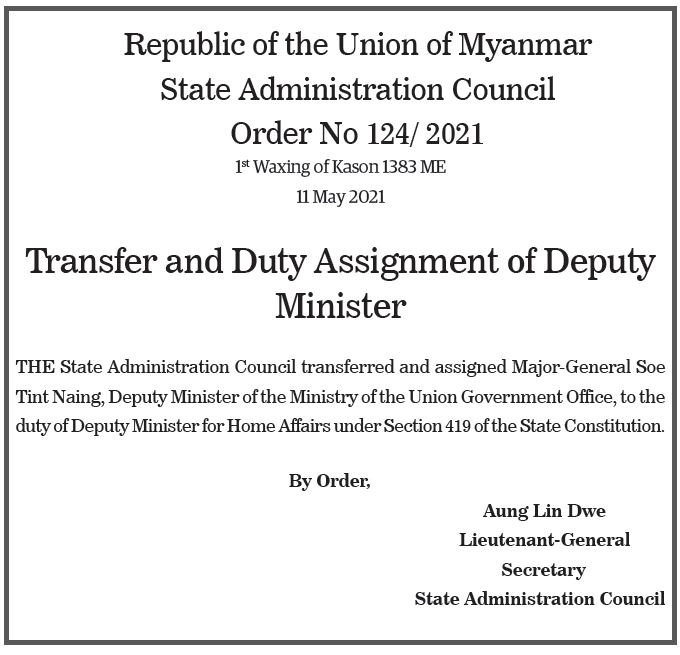 Submitted by moiuser on 12 May 2021 Transfer and Duty Assignment of Deputy Minister #The_Global_New_Light_Of_Myanmar