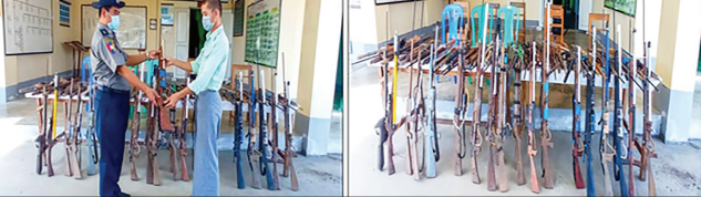 On 14 May, the people from Padaung Township gave 44 handmade guns, and the people from Nattalin Township of Bago Region transferred five percussion rifles to the security members on 14 May.