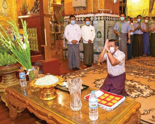 Chairman of the State Administration Council Commander-in-Chief of Defence Services Senior General Min Aung Hlaing, accompanied by his wife Daw Kyu Kyu Hla, Council members and officials, yesterday morning paid homage to Maha Muni Buddha Image in Mandalay.