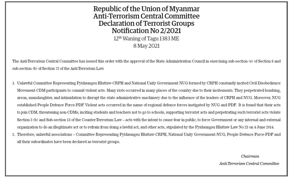 Submitted by moiuser on 20 May 2021 Republic of the Union of Myanmar Anti-Terrorism Central Committee Declaration of Terrorist Groups Notification No 2/2021 #TheGlobalNewLightOfMyanmar