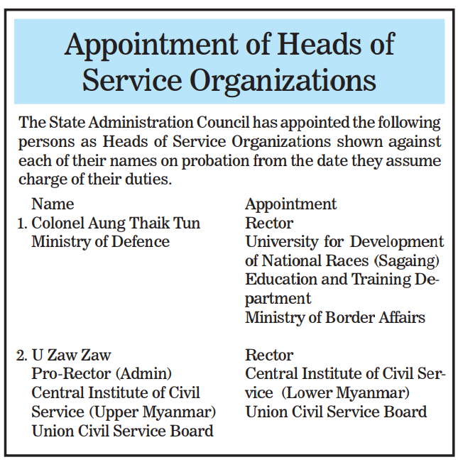 Submitted by moiuser on 21 May 2021 Appointment of Heads of Service Organizations #The_Global_New_Light_of_Myanamar