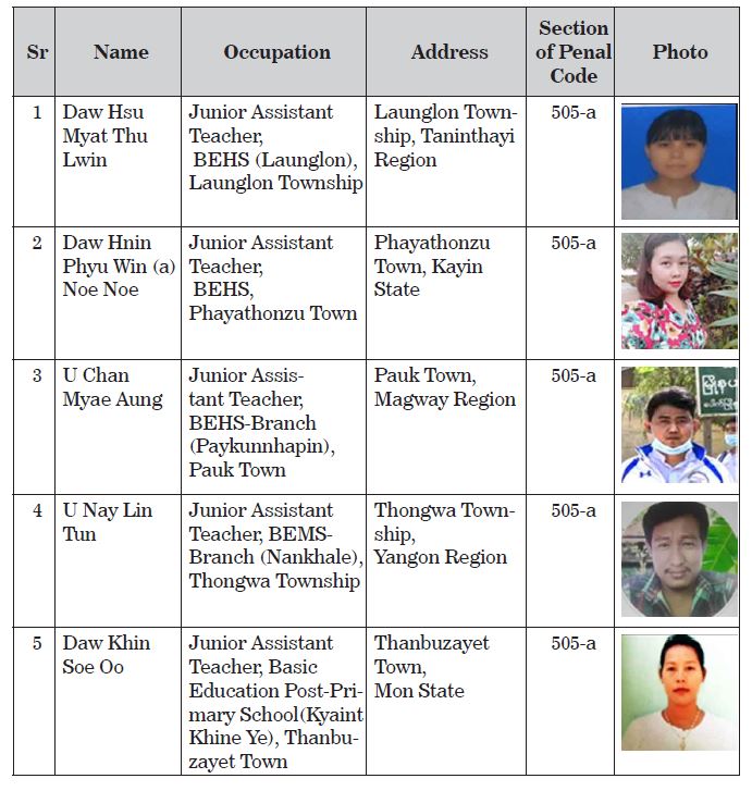 THE following teachers have been charged under Section 505-A of the Penal Code for inciting State service personnel and education staff to participate in CDM activities, themselves participating in it, supporting CDM activities and CRPH and NUG unlawful association with the aim of deteriorating the State adminis-trative machinery.