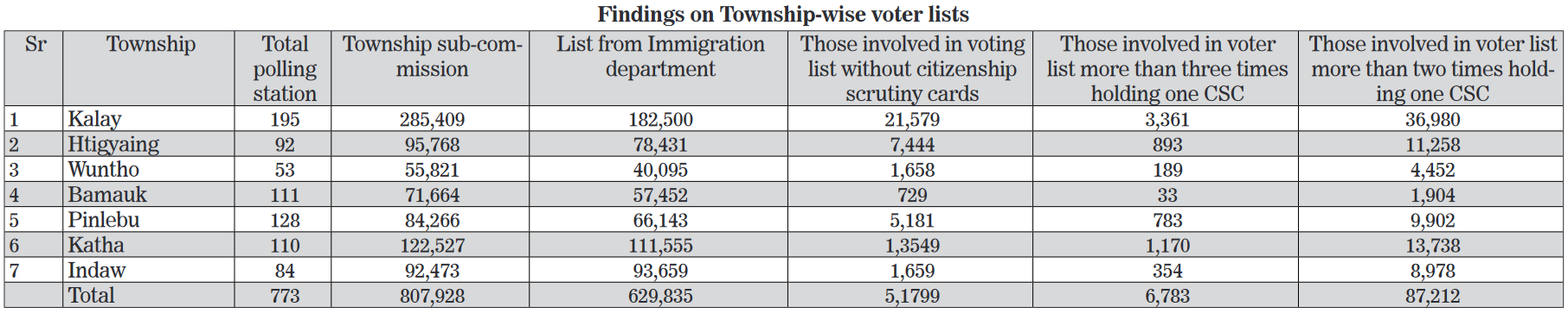 2. According to the inspection, the previous election commission released 807,928 eligible voters in these seven townships in Sagaing Region. The list of the Ministry of Labour, Immigration and Population in November 2020 showed 629,835 eligible voters who had turned 18. The voter lists mentioned that there were 51,799 citizens, associate citizens, naturalized citizens, and non-identity voters, 6,783 persons repeated on the voter lists more than three times and 87,212 persons repeated on the voter lists two times.