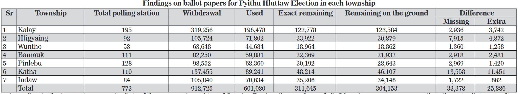 13. It found voting frauds in Kalay, Htigyaing, Wuntho, Bamauk, Pinlebu, Katha and Indaw townships in Sagaing Region. The excess/shortage ballots were found in the inspection. They failed to follow the stipulations of the Hluttaw Election Law and Rules.