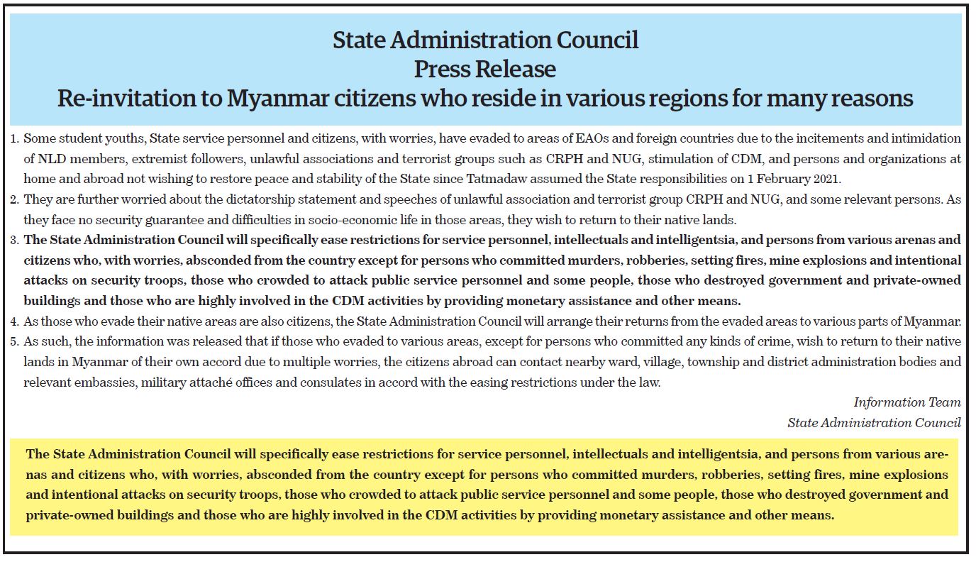 Submitted by moiuser on 31 May 2021 State Administration Council Press Release Re-invitation to Myanmar citizens who reside in various regions for many reasons #The_Global_New_Light_Of_Myanmar