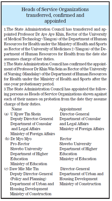 Submitted by moiuser on 4 June 2021 Heads of Service Organizations transferred, confirmed and appointed #The Global New Light of Myanmar